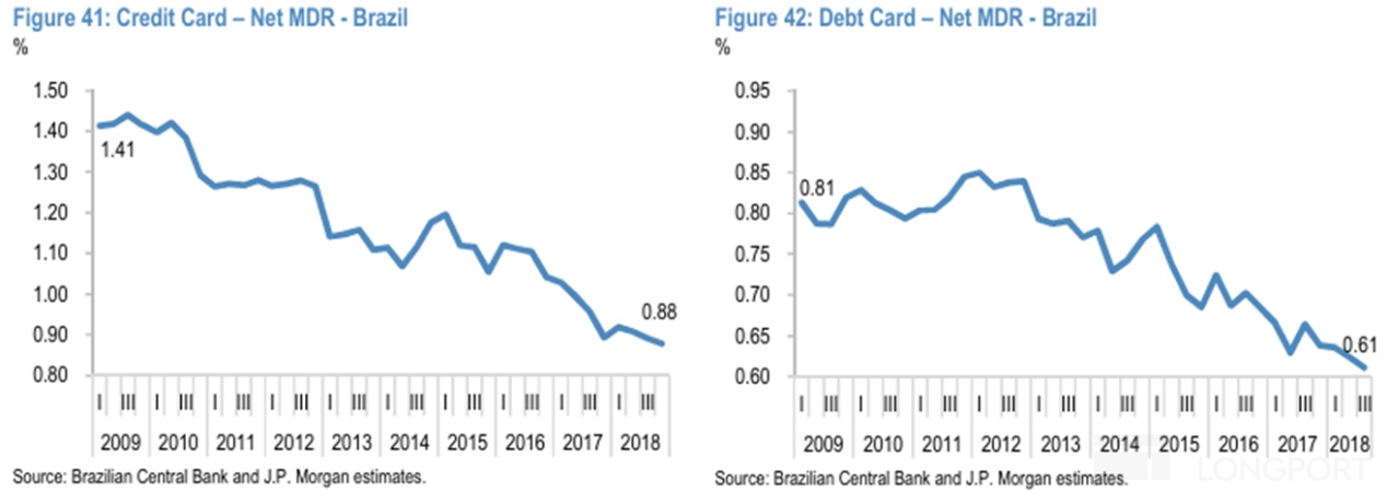 支付行業實際普遍呈現隨著市場和公司越發成熟,行業和公司的淨變現率逐步走低的現象。根據巴西中央銀行披露的數據,在2009年到2018年間,以信用卡支付淨變現率從1.4%下降到0.88%(53bps),以借記卡支付情況下也走低了20bps。