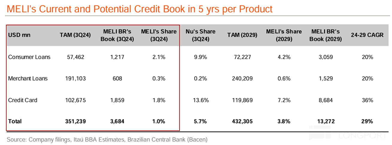 從市佔率和行業規模上,根據某巴西本地券商的測算,單看巴西這一國市場,在24年底Meli各細分類別的貸款規模佔對應類別貸款總市場規模的比重都僅為低個位數%,各個類別合計加總後Meli的市場份額也僅1%。