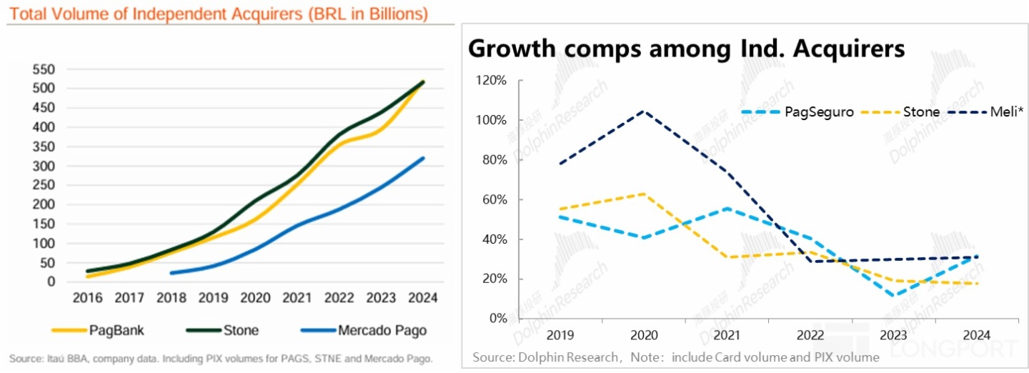 但是也能看到,在上述三家新興支付公司内部,Meli旗下的Pago的份額目前是最低的。根據外資行的測算,2024年Mercado Pago在巴西市場的支付規模大約是PagS和Stone規模的60%。且上述Mercado Pago的支付額中約40%是來自體係内的,因此若只看體係外支付的體量,Pago大約只有同行體量的不足40%。