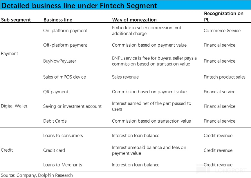 因此在本篇中,海豚將詳細展開對公司金融業務的探討。簡單來說,公司的金融業務由支付和信貸兩個大板塊構成,還有一項處在兩者中間地帶的數字錢包業務(兼具一些支付和信貸的功能)主要從商業邏輯的角度出發,關注公司是如何佈局的這些行業,而這些業務又反過來給公司帶來了哪些價值
