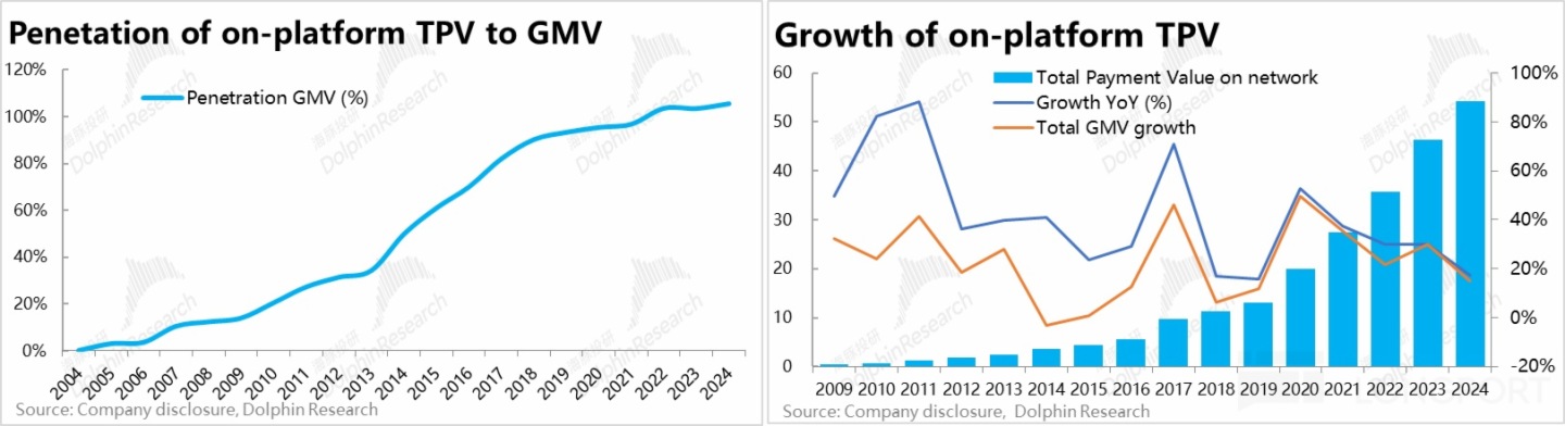 根據披露,自2003年支付功能上綫,至2022年平台内支付額佔成交額的滲透率已達100%以上(GMV指標不包括非電商業務的成交額,因此GTV/GMV會超過100%)。增速上,也可見2020年開始體係内GTV的增速已基本和GMV增速趨於一致。