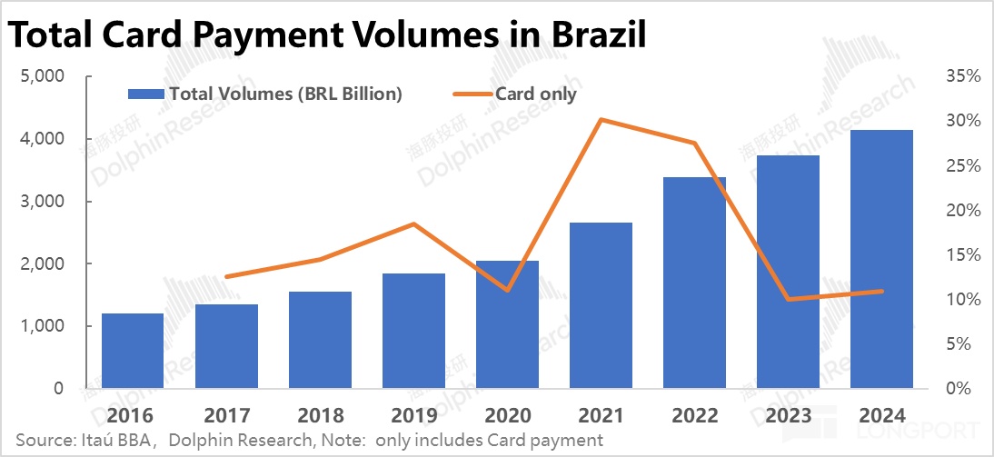 行業體量上,僅考慮刷卡支付,巴西支付市場的整體規模略超4.1萬億巴西裡拉,對應近$7600億。走出疫情後的高速增長期後,近兩年刷卡支付額的整體增速回落到約10%左右。