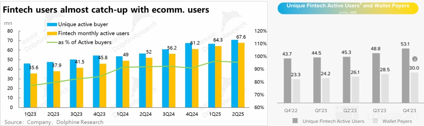 根據公司的披露,截至2Q25公司金融業務的月活用戶已達近6800萬,已達其電商業務季度活躍用戶體量的95%以上。其中按公司在4Q23的最後一次披露,公司的數字錢包用戶規模為3000萬,佔當時整體金融業務月活的近57%。