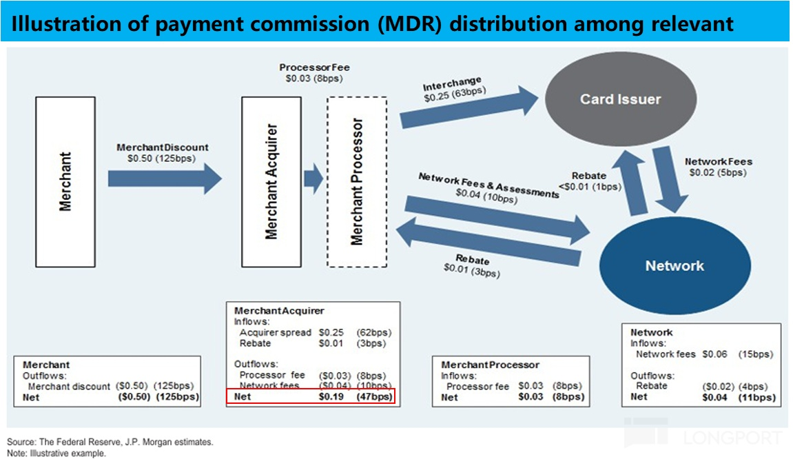 仍以上圖在美國使用借記卡支付的情況為例,1.25%的總支付費率中收單方能留存的淨費率只有約47bps,佔總費率的38%。根據消費者選擇的支付方式不同,總支付費率和收單方能留存的淨費率都會隨之波動。整體上根據美國市場的行業慣例,收單方所能留存的淨費率佔比一般為整體費率的20%~40%之間。