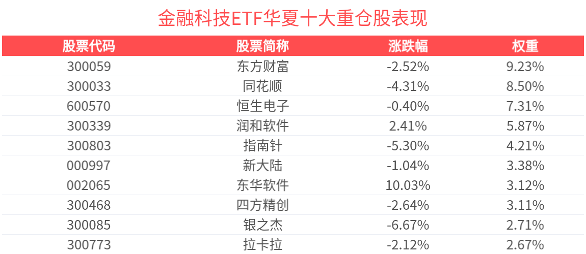金融科技ETF華夏緊密跟蹤中證金融科技主題指數,截至2025年8月29日,指數前十大權重股分別為同花順、東方財富、恒生電子、指南針、潤和軟件、東華軟件、銀之傑、新大陸、四方精創、廣電運通,前十大權重股合計佔比54.08%。