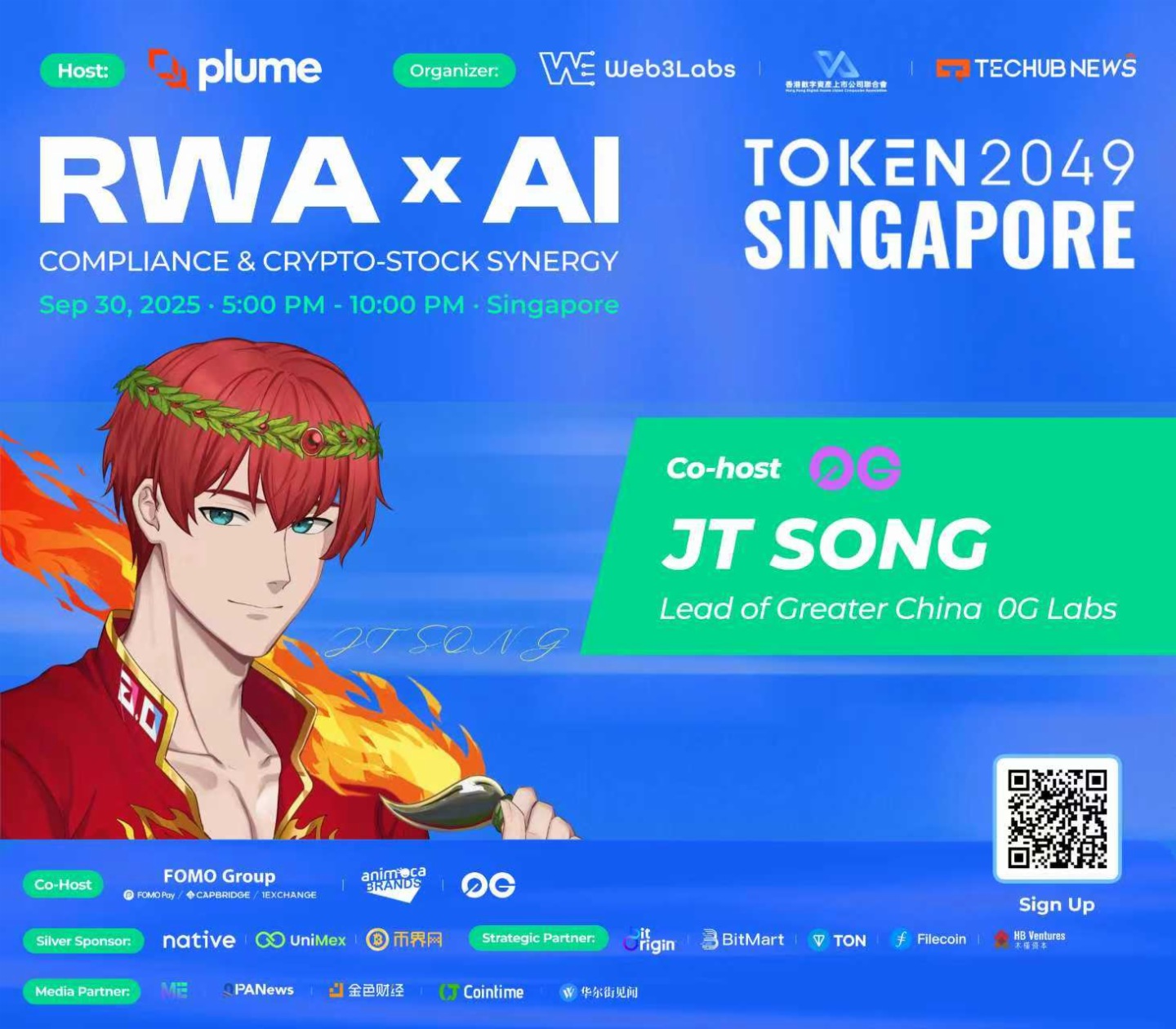 Techub News 消息,0G Labs 華語負責人 JT Song 確認出席 2025 年 9 月 30 日在新加坡舉辦的「RWA x AI COMPLIANCE & CRYPTO-STOCK SYNERGY」並成為本次活動聯合主辦。