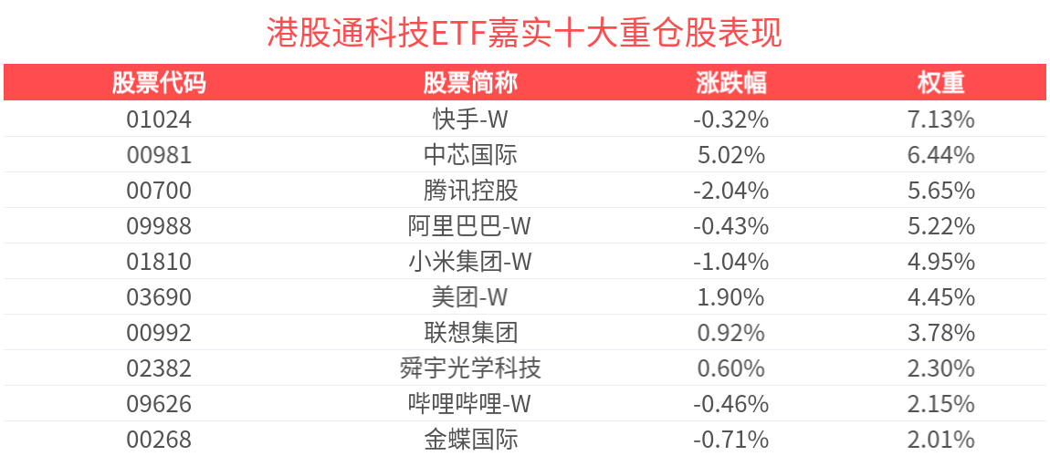 數據顯示,截至2025年8月29日,恒生港股通科技主題指數(HSSCITI)前十大權重股分別為中芯國際、快手-W、騰訊控股、阿裡巴巴-W、小米集團-W、美團-W、聯想集團、商湯-W、舜宇光學科技、哔哩哔哩-W,前十大權重股合計佔比72.98%。