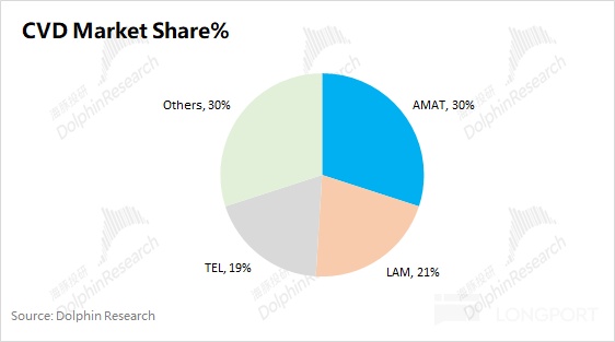 ②化學氣相沉積 CVD 設備:類似 「用氣體在矽片表面 ‘吹’ 出薄膜」,適合鍍絕緣層。應用材料 AMAT 處於第一梯隊,相對領先。全球的 CVD 設備市場空間約 130 億美元,應用材料的市場份額約為 30%,與 LAM(21%)、TEL(19%)同處於第一梯隊,仍有一定的優勢。
