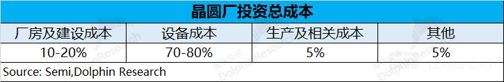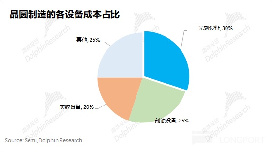 根據 SEMI 的數據,如果要投資建造一座晶圓制造廠,半導體設備是最大的成本項,大致將佔到總成本的 70-80%。作為半導體制造的核心設備,光刻機在設備支出中佔 30%,刻蝕設備佔比約 25%,薄膜設備佔比約 20% 左右。換算之下,這三類設備在總成本中就超過了 50%。