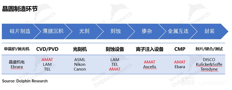 除光刻以外,應用材料 AMAT 的設備基本覆蓋了晶圓制造的中間環節,尤其是公司能提供産業鏈中價值量較高的刻蝕設備和薄膜沉積設備。