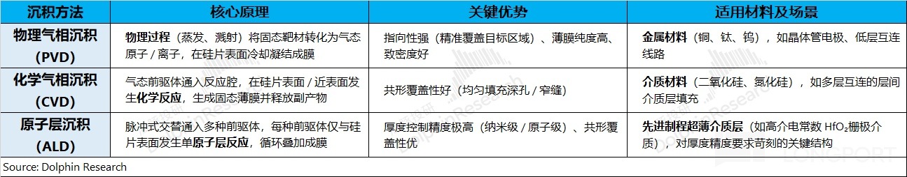從最終的沉積效果來看,PVD 是指向性強(精準覆蓋),適合沉積金屬材料;CVD 和 ALD的沉積覆蓋性較好,適合沉積介質材料,其中 ALD 對薄膜厚度的要求精準度高,但沉積速度較慢。