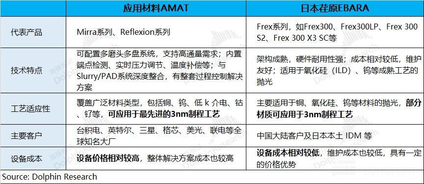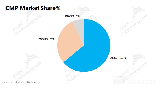 在 CMP 設備領域,應用材料 AMAT 也是擁有絕對領先的地位,佔據了 60% 以上的市場份額。競爭對手主要是日本荏原 EBARA,兩家公司合計佔據了 9 成以上的市場份額。