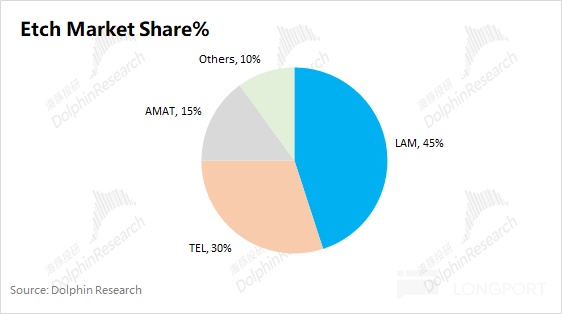 應用材料 AMAT 目前在刻蝕領域是追隨者的角色,大致佔據 15% 的市場份額。在刻蝕市場中,LAM 和東京電子都是市場的領先者。