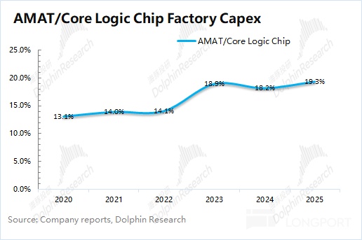 如果將應用材料 AMAT 的晶圓代工及邏輯類收入與上述的邏輯類核心七大公司的資本開支擬合,大致可以看到,應用材料半導體設備在邏輯類晶圓制造廠的總資本開支中大約佔比在 1-2 成。