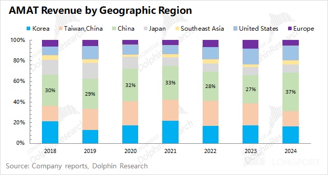 而應用材料的發展,本身就是一部 「半導體産業的發展史」。在 1970s-1980s 年代,應用材料的收入增量主要來自於日本地區。在當時的全球前二十的半導體企業中,日本擁有其中的 12 家。而伴隨著三星、海力士以及台積電的崛起,在 1990s 年代韓國和中國台灣地區逐漸成為應用材料收入來源的前兩位。而在中國大陸地區半導體産業發展的推動下,近年來已經成為應用材料的最大收入來源,收入佔比達到 3 成以上。
