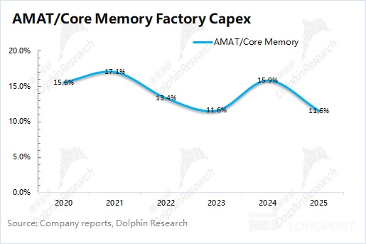 如果將應用材料 AMAT 的存儲類收入(DRAM 和 Flash memory)與上述的存儲核心三大公司的資本開支擬合,大致可以看到,應用材料半導體設備在存儲類 IDM 廠的總資本開支中大約佔比在 1 成。相比而言,應用材料 AMAT 的設備在存儲類工廠的佔比略低於邏輯類工廠。
