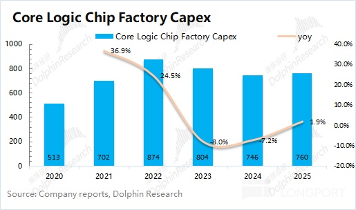 整體來看,海豚君預期七大核心邏輯芯片廠商的資本開支合計為 760 億美元左右,同比增長 1.9%。