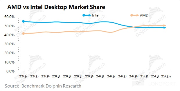 英特爾在 PC 市場也受到 AMD 的明顯沖擊,尤其是在桌面級 CPU 市場中,AMD 的市場份額已經實現了對英特爾的反超。