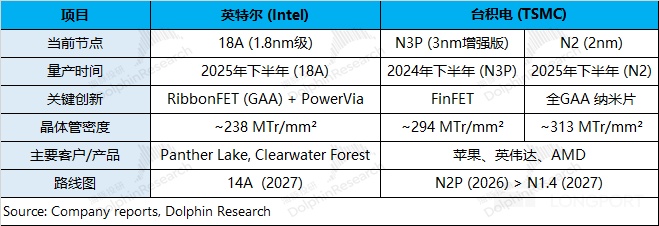 而對外代工進展上,並未得到市場信任,公司寄希望能在 18A 節點實現突破。從晶體管密度看,18A 仍明顯低於台積電的 N3P,當然市場本身也接受它的落後。