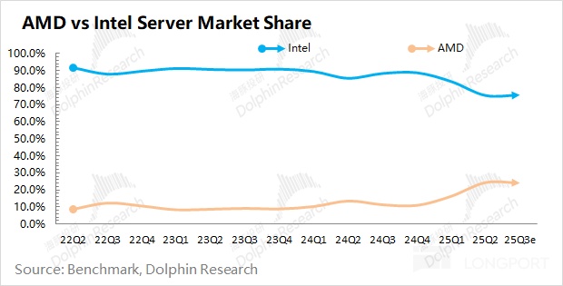 英特爾自身在 GPU 産品失敗的情況下,自己原本的強項——數據中心 CPU 服務器,由於競對 AMD 和英偉達在銷售 GPU 時各自捆綁了自己研發的 ARM 構架 CPU 來搭售機架和係統集成級別的方案,這導致即使是在數據中心 CPU 市場,它的市場份額也在從原本的 80-90% 滑落到了 75% 上下。