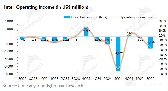 而以上(①——③)共振的結果就是,從 2022 年以來,英特爾在經營上持續面臨著虧損的問題。雖然賬上還有 96 億美元的現金及等價物,但仍禁不住持續的虧損。如果按 40 億美元/年的虧損速度,這錢也就只能虧損 2 年左右。