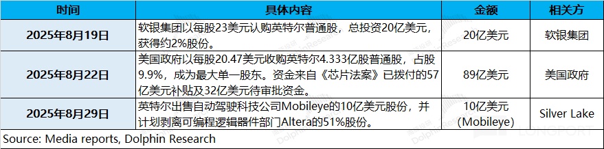 來看一下,自 8 月以來,英特爾進行了一係列的操作,其中分別引入了軟銀、美國政府和英偉達成為公司股東,並出售了 Mobileye 的股份。
