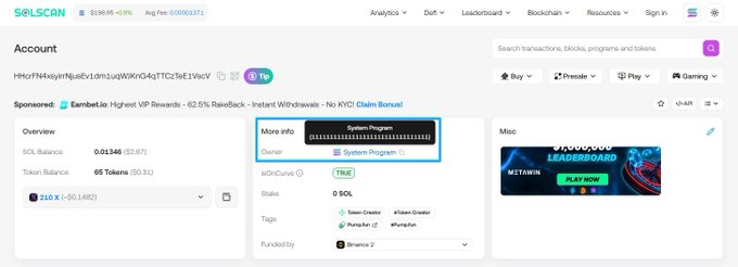 查看浏覽器會發現,普通地址的 Owner 擁有者是 System Program,地址固定為 11111111111111111111111111111111 。