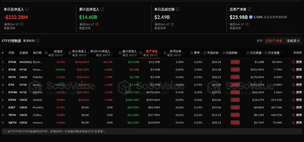 PANews 10月18日消息,根據 SoSoValue 數據,昨日(美東時間 10 月 17 日)以太坊現貨 ETF 總淨流出 2.32 億美元。