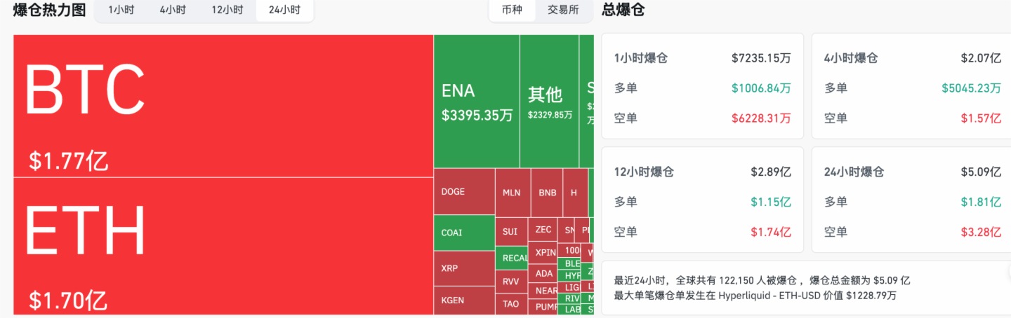 24小時爆倉數據:全球共122150人被爆倉 ,爆倉總金額為5.09億美元,其BTC爆倉1.77億美元、ETH爆倉1.7億美元、ENA爆倉3395萬美元