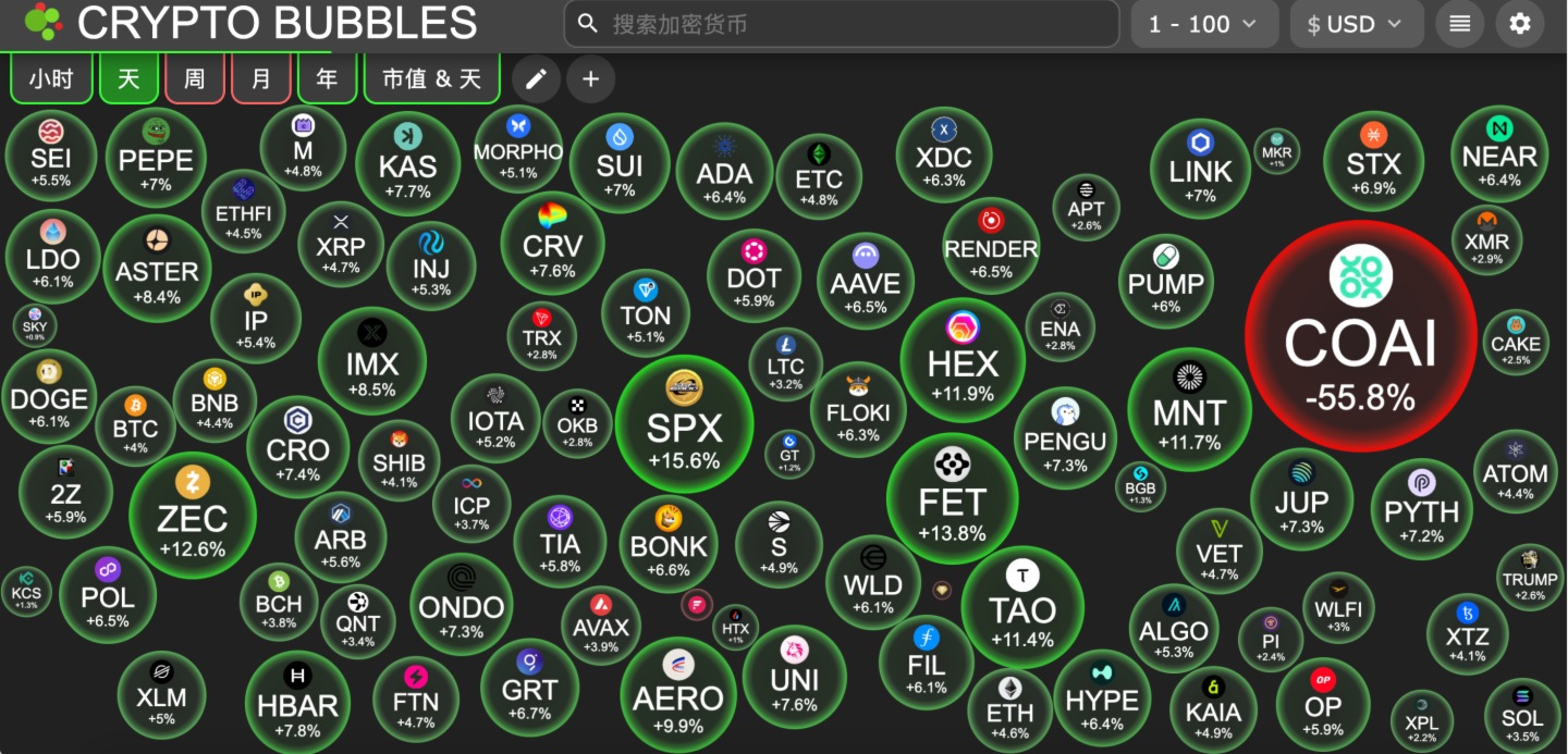 今日市值前100幣種最大漲幅:SPX6900漲15.6%、ASI Alliance漲13.8%、Zcash漲12.6%、HEX漲11.9%、Mantle漲11.7%。