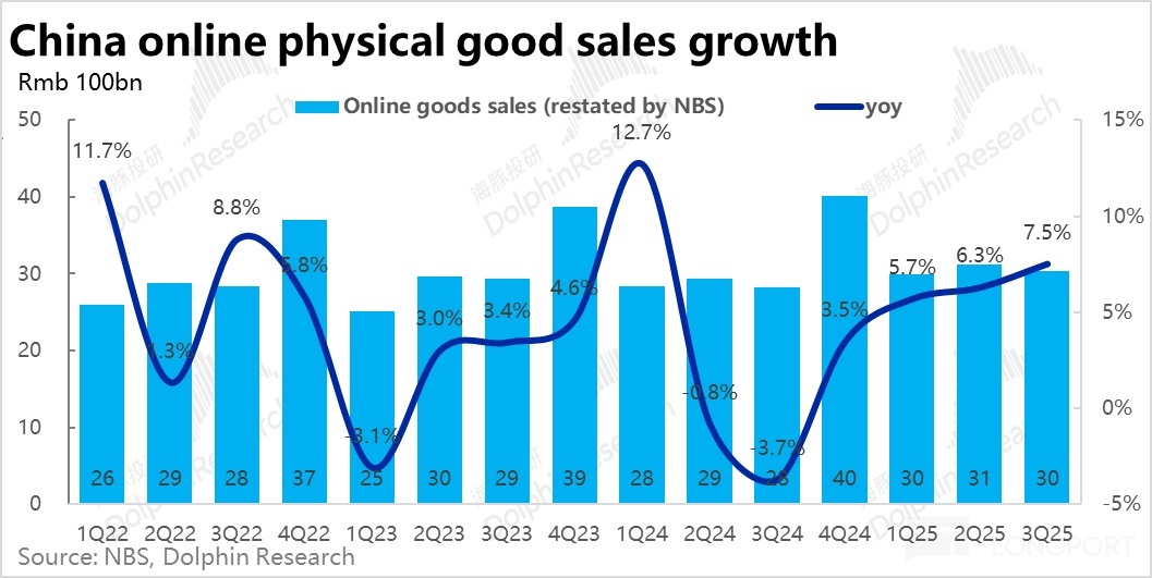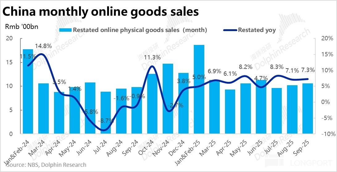 和前幾個月的情況相似,在整體社零疲軟的情況下,綫上實物零售(經調整後)的標準則明顯更強。調整後 9 月綫上實物零售同比增長 7.3%,整個 3Q 季度綫上實物零售合計同比增長 7.5%。