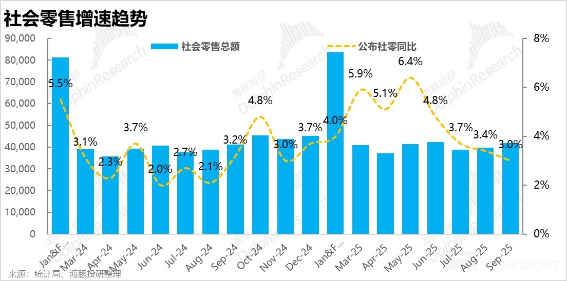 根據統計局直接披露的數據,9 月國内社零總額同比增長了 3%,相比上月繼續走低,國内居民消費看起來越發疲軟。若後續幾個月趨勢得不到反轉,可能要下探 24 年 9 月大反轉前的低谷水平。