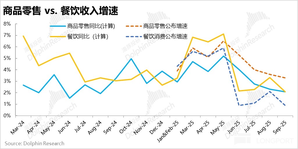 分消費類型看,按統計局直接披露的增速,商品零售和餐飲消費的增速都在環比走弱,但其中商品零售的走弱相對輕微,主要是餐飲收入增速下滑非常明顯。具體來看,商品零售的收入增速為 3.3%,而餐飲收入的增速再度跳水式至僅 0.9%。