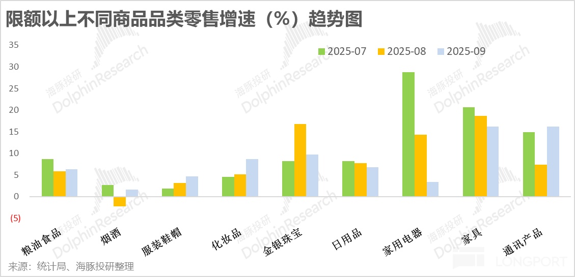 分商品品類來看,隨著逐步進入去年 9 月開始的國補高基數期,按統計局披露的規模以上銷售數據中,家用電器和家具品類的銷售增速都有不小回調。其中家用電器的增速已僅剩 3.3%,已從先前的主要拉動力反變成了主要的拖累項。