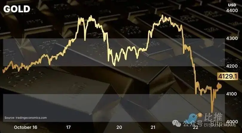 過去24小時内,在沖破4300美元歷史高點後,金價急轉直下,24小時内暴跌超6%,市值蒸發2.1萬億美元—-這個數字,比當時整個加密貨幣市場的總市值還要高出一半。據TradingView數據,這一跌幅也創下自 2020 年以來最大單日降幅。