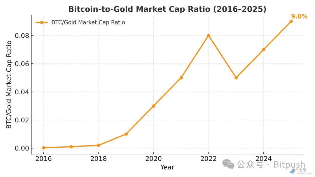 從更宏觀的視角看,比特幣在傳統金融體係中仍是一個“輕量級選手”。盡管市值已達2.1萬億美元,但這僅為黃金市值的1/14,在全球金融資産中的佔比不足2%。正是這種巨大的“市值差距”,被機構視為未來的增長空間。