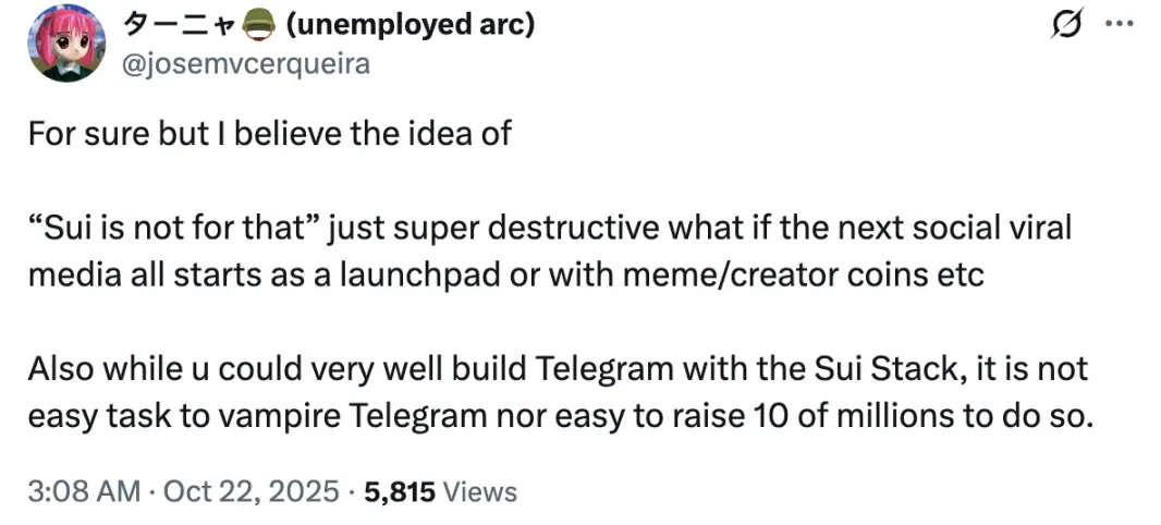 對此,Move 生態 Web3 解決方案提供商 IPX Labs 成員,也是 Sui 生態 meme/launchpad 項目開發者,X handle 為 @josemvcerqueira 的用戶表示了贊同,並委婉地表示 Sui 也存在與以太坊生態類似會根據自身喜好來判斷項目好壞的問題。