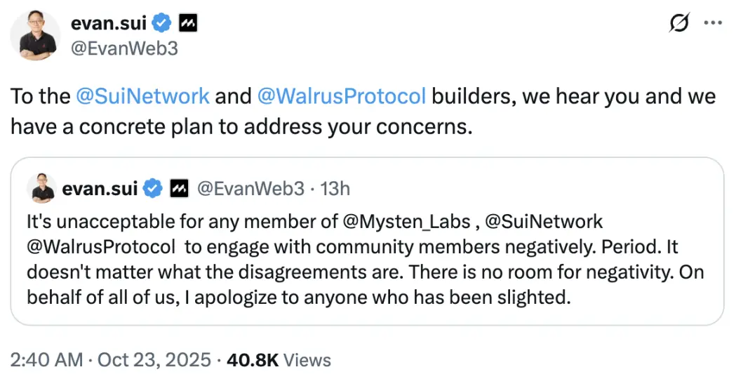 在意識到團隊成員說了一些不該說的話之後,Sui 聯創兼 CEO Evan Cheng 出面表示向所有被輕視的人道歉並稱無論分歧是什麼,Mysten Labs、Sui 與 Walrus 的任何成員與社區進行消極的溝通都是不被允許的。之後,Evan Cheng 表示將向 Sui 和 Walrus 的建設者提供具體的計劃來解決問題。