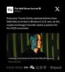 2025年3月,《华尔街日报》突然爆出猛料:特朗普家族的代表从2024年起一直与币安方面密洽,讨论由特朗普家族收购币安美国分公司部分股权,同时透露CZ正寻求总统特赦 。这篇报道震动业界,也将CZ再次推上风口浪尖。
