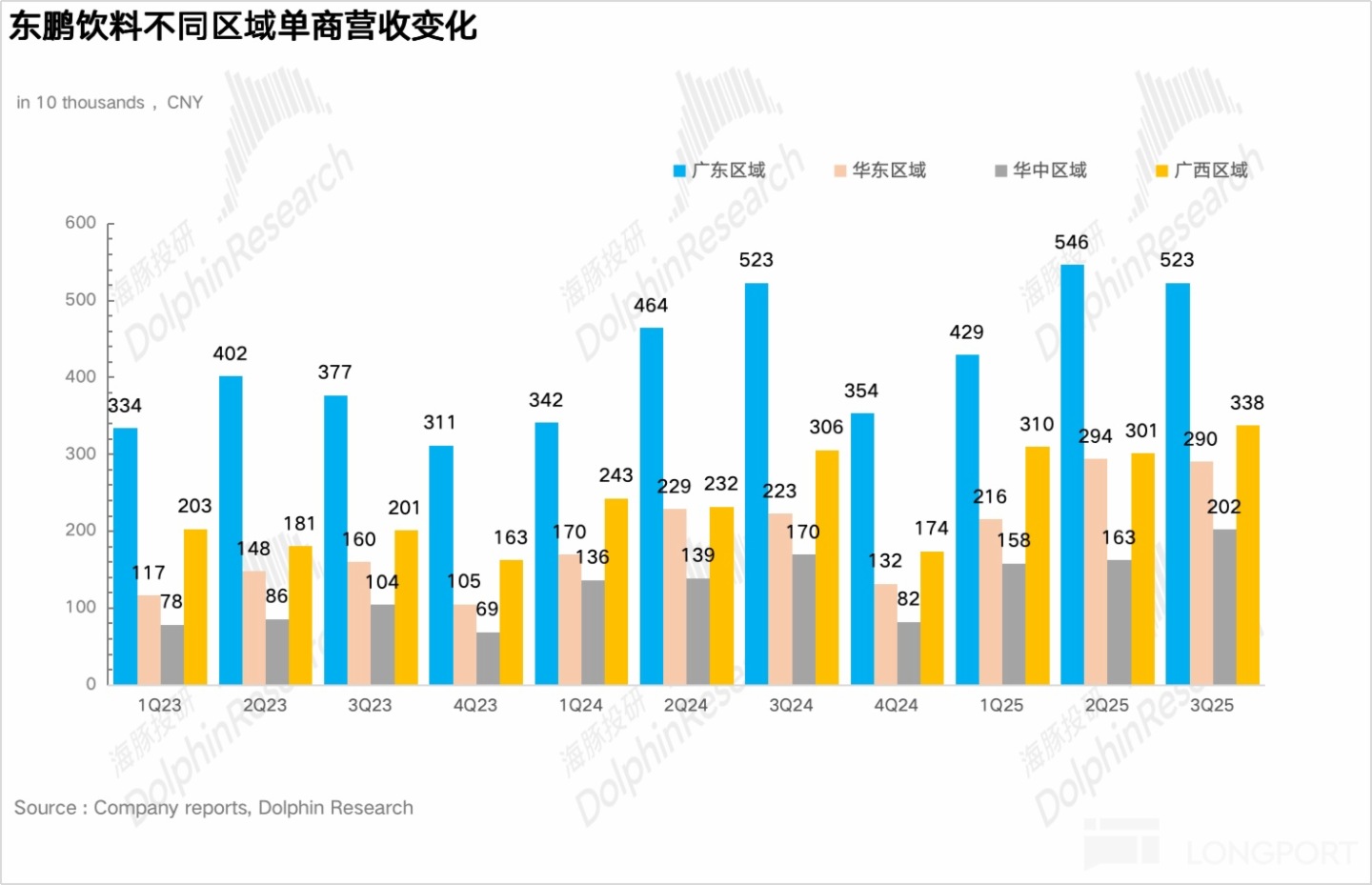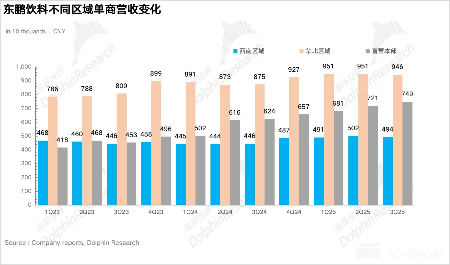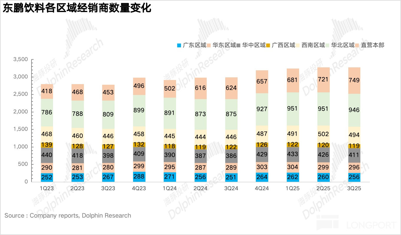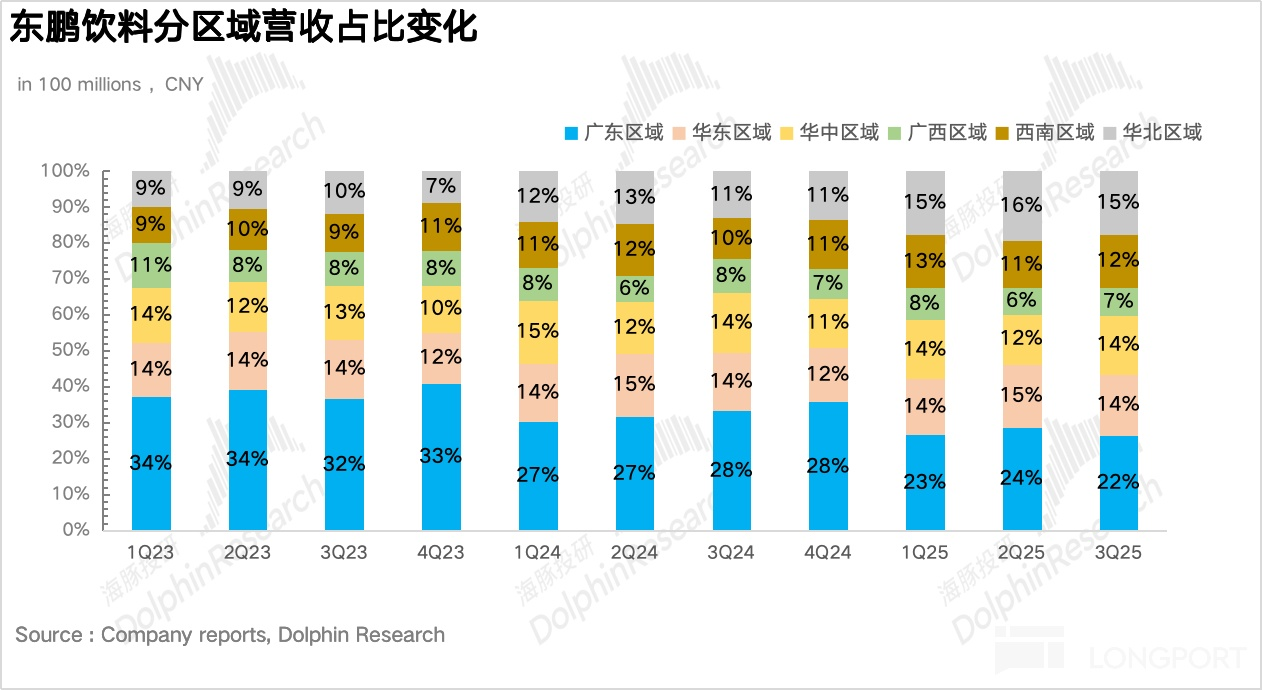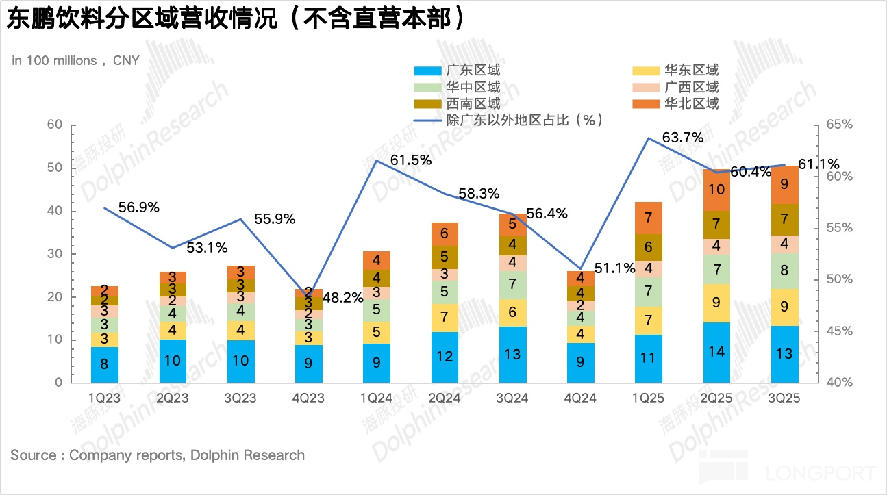 除廣東以外的其他地區實現營收 37.3 億元,同比增長 42%,仍然呈現出高於大盤增速的高速增長階段。其中華北地區連續 3 個季度實現超過 70% 的增長,表現極為亮眼。如果把時間綫推到 3 年前,彼時華北地區還是東鵬最為薄弱的環節,營收僅為 6 億元,佔比不足 7%。