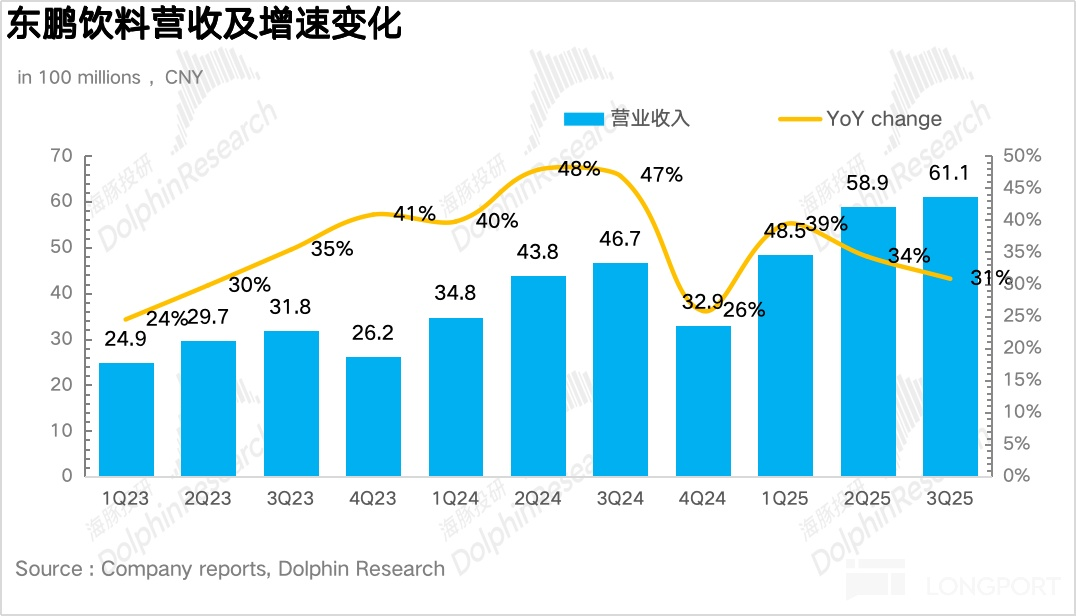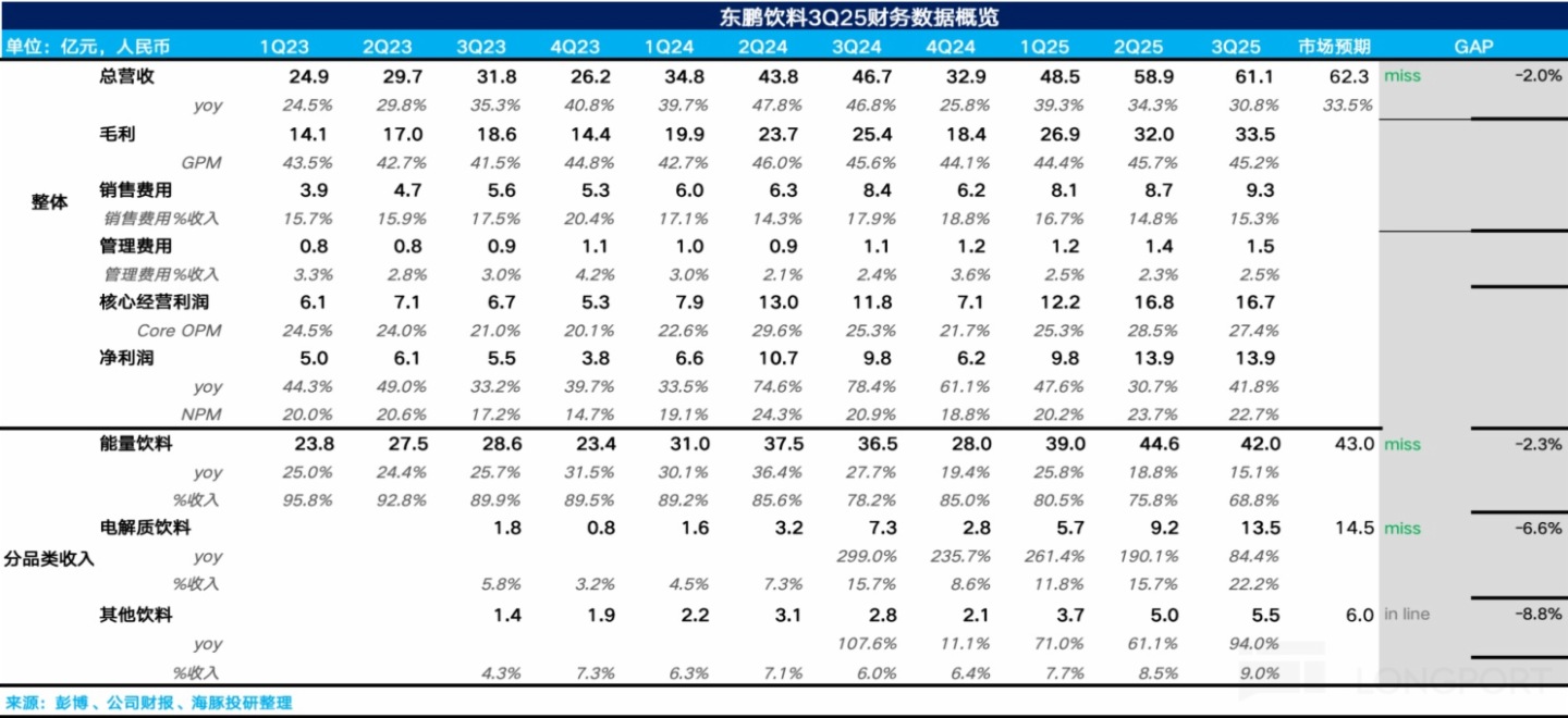 3Q25 東鵬飲料實現總營收 61.1 億元,同比增長 30.8%,從趨勢上看環比前兩個季度有所降速。雖然公司的 「第二增長曲綫」 電解質水依然在快速增長,但由於市場對東鵬的能量飲料業務預期仍然較高,因此整體業績略低於市場預期。