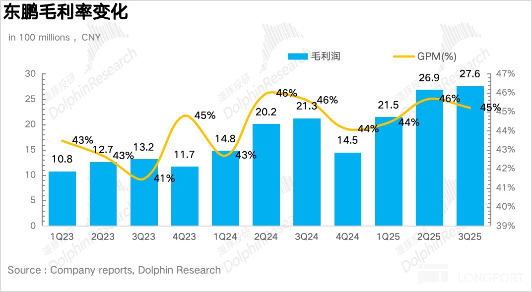 利潤端,由於東鵬二季度費用投放的前置疊加整體公司經營槓桿的釋放,3Q25 東鵬實現利潤 13.9 億元,同比增長 41.8%,仍然快於營收端的增長,整體的業績質量還是比較高的。