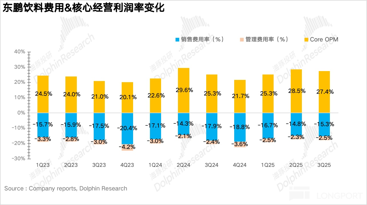 費用端,由於公司二季度前置的費用投放疊加公司的持續精細化運營,整體費用率有所下降,最終,東鵬核心經營利潤提升 2.1pct 達到 27.4%。