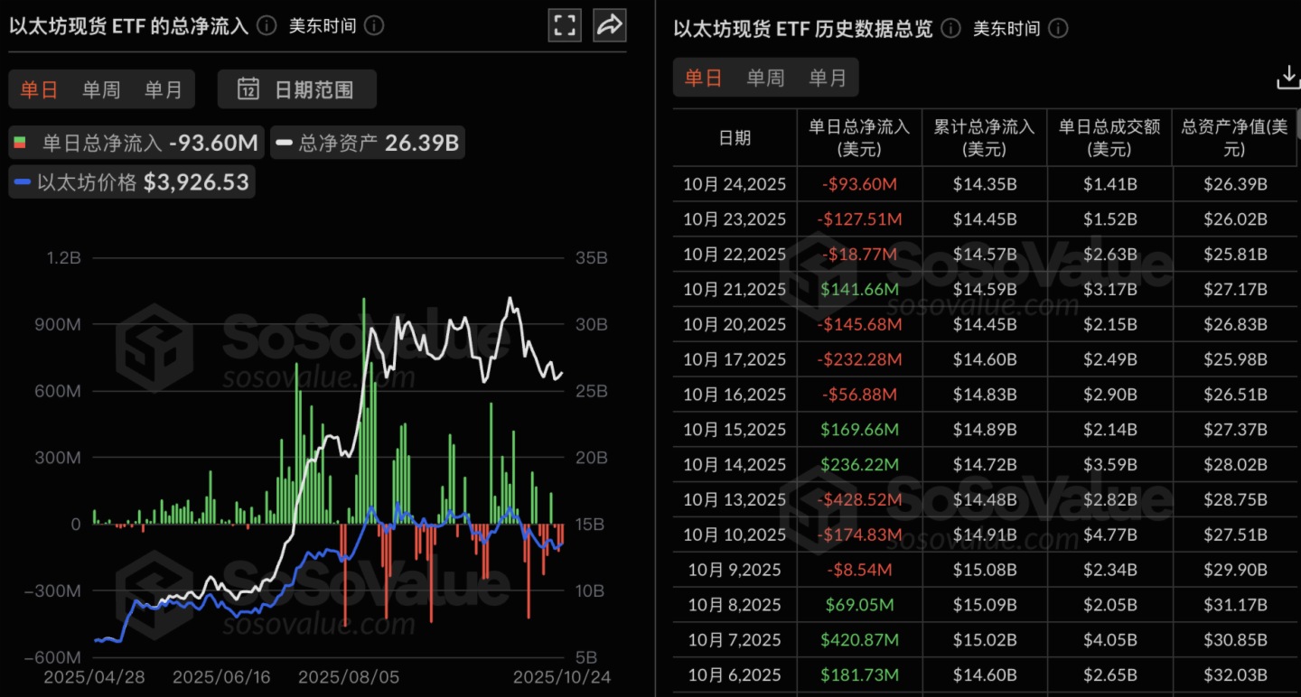 PANews 10月25日消息,根據 SoSoValue 數據,昨日(美東時間 10 月 24 日)以太坊現貨 ETF 總淨流出 9359.57 萬美元。