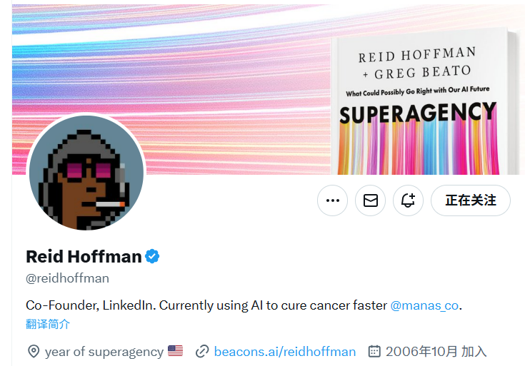 PANews 10月26日消息,領英聯創 Reid Hoffman 將 X 賬號的頭像改為 Cryptopunks NFT,並表示:“幾個月前買入了這個 NFT,自 2013 年以來一直在加密領域進行投資,現在很高興加入該領域最具影響力的社區之一。”