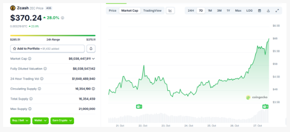 PANews 10月27日消息,據Coingecko最新數據顯示,Zcash原生代幣ZEC市值突破60億美元,現報6,038,447,911美元,續創歷史新高。ZEC現報370.24美元,24小時漲幅28%。據悉,Zcash擬於下個月迎來減半,預計發行量將大幅下降。