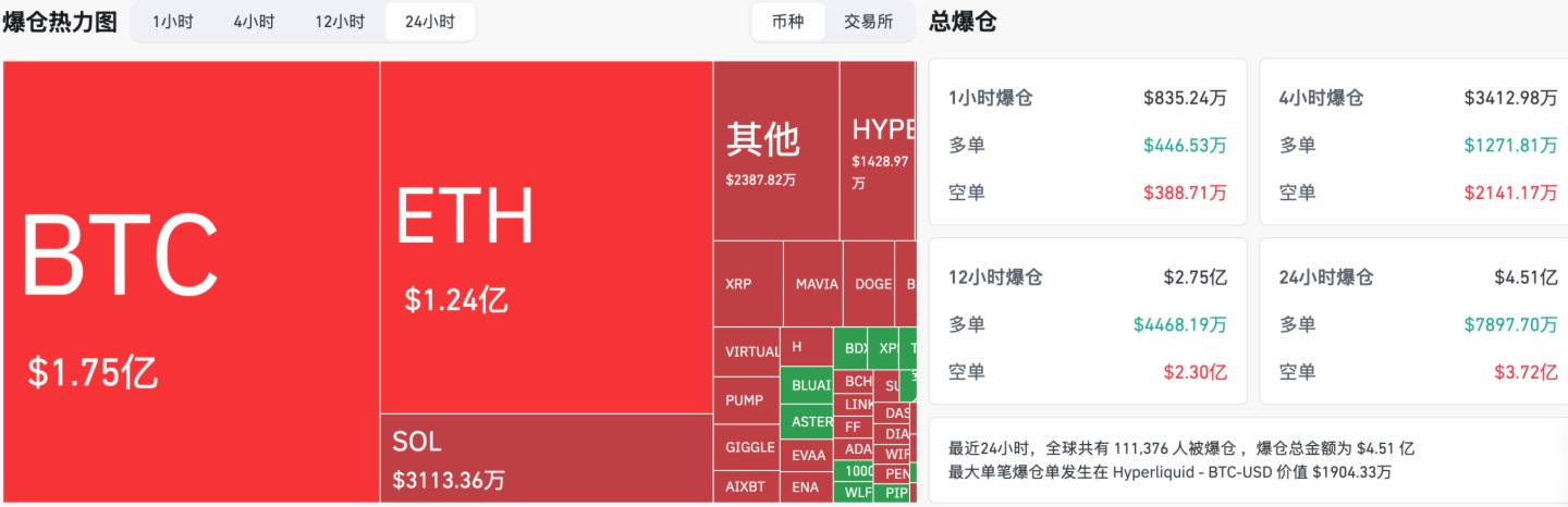 24小時爆倉數據:全球共111376人被爆倉 ,爆倉總金額為4.51億美元,其BTC爆倉1.75億美元、ETH爆倉1.24億美元、SOL爆倉3113萬美元