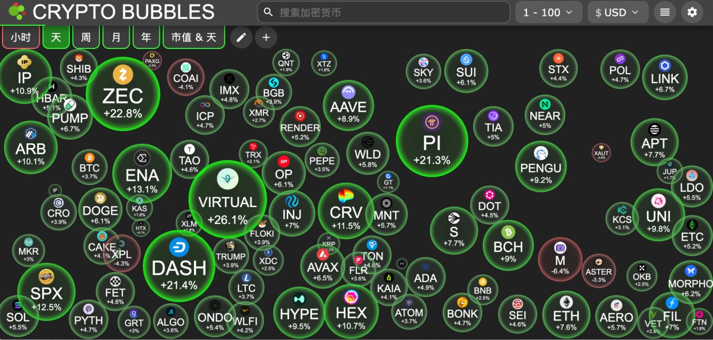 今日市值前100幣種最大漲幅:Virtuals Protocol漲26.1%、Zcash漲22.8%、Dash漲21.4%、Pi Network漲21.3%、Ethena漲13.1%。