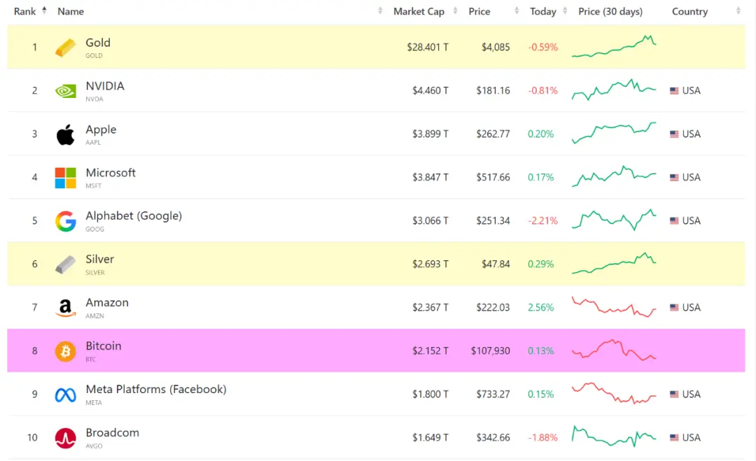 據 companiesmarketcap 統計顯示,目前在全球 Top10 資産中,黃金處於絕對領先地位,其總市值規模(28.4 萬億)遠超後面 9 名之和(26 萬億)。