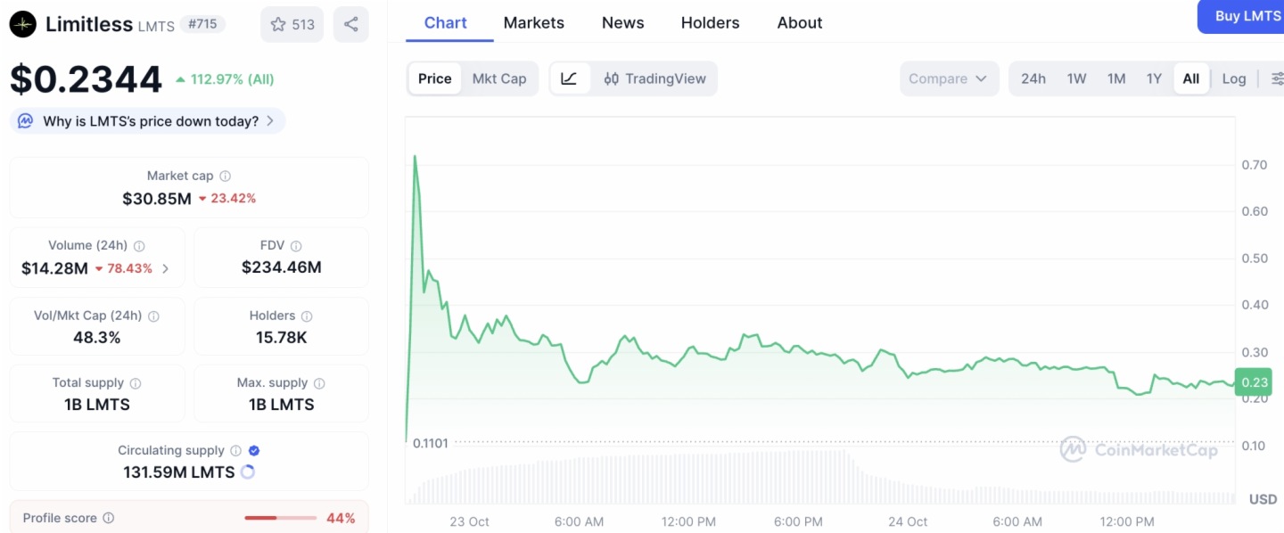 根據 CoinMarketCap 數據,LMTS 在上綫初期一度沖高,但隨後迅速下跌超過 60%,流動性驟降。社區信心在短時間内崩潰,KOL 與用戶在社交平台上爭論不休。部分投資者認為,團隊以“防狙擊”為名操作大量資金,實質上模糊了内部行為的邊界;而另一些人則指出,項目方的公關節奏與信息披露過於滯後,讓市場恐慌情緒持續放大。